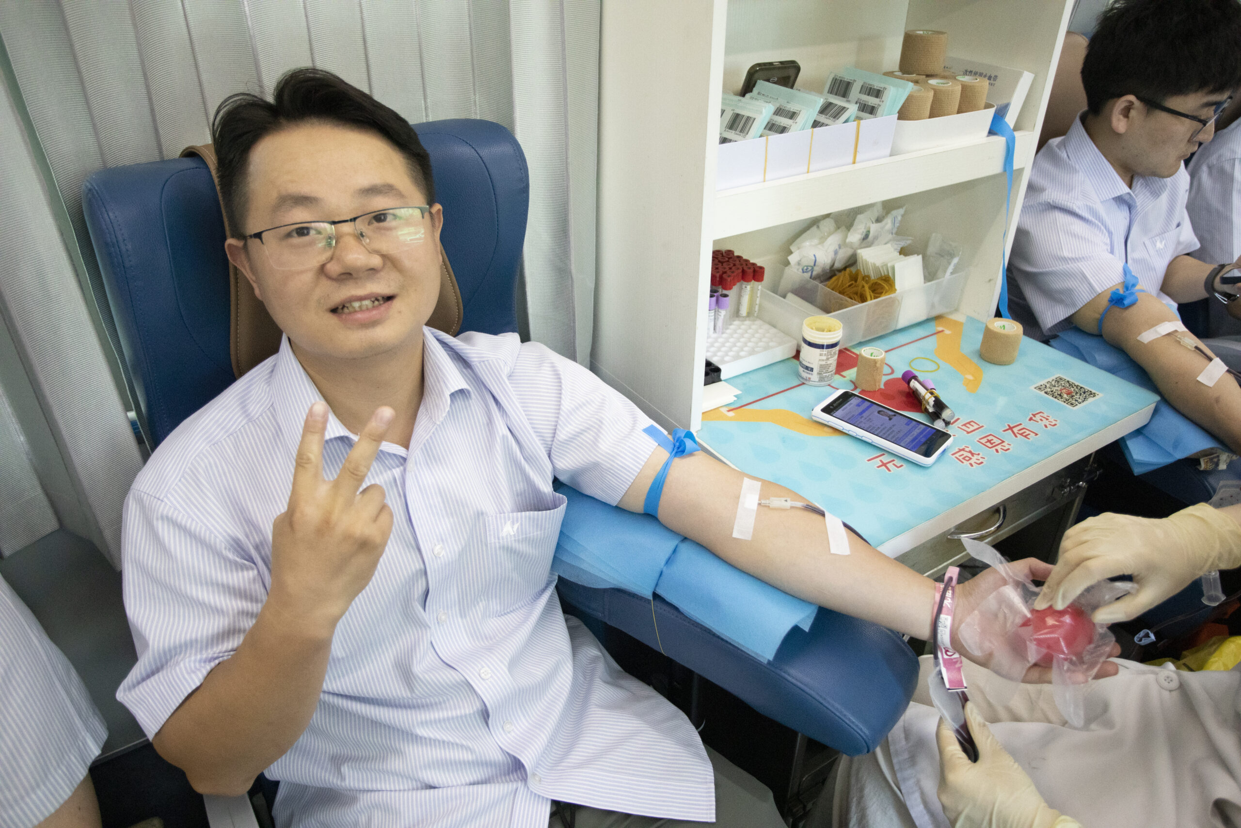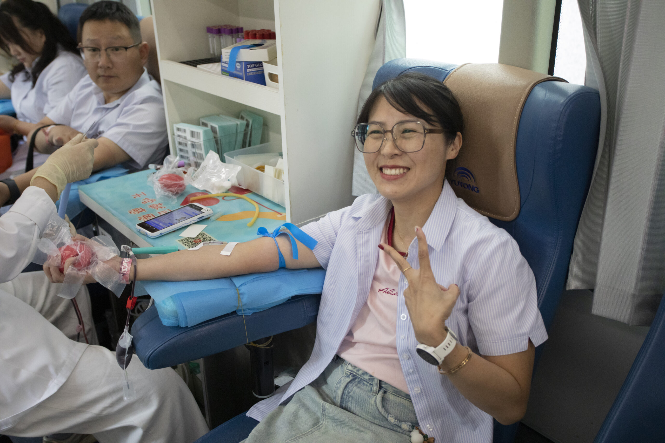 ? ? ? 血液達(dá)到符合規(guī)定標(biāo)準(zhǔn)的員工進(jìn)入采血車進(jìn)行獻(xiàn)血。他們中有每年都參與無(wú)償獻(xiàn)血的“老將”,也有初次上陣的“新兵”,醫(yī)護(hù)人員專業(yè)而耐心地為職工們服務(wù),確保每個(gè)環(huán)節(jié)安全可靠。