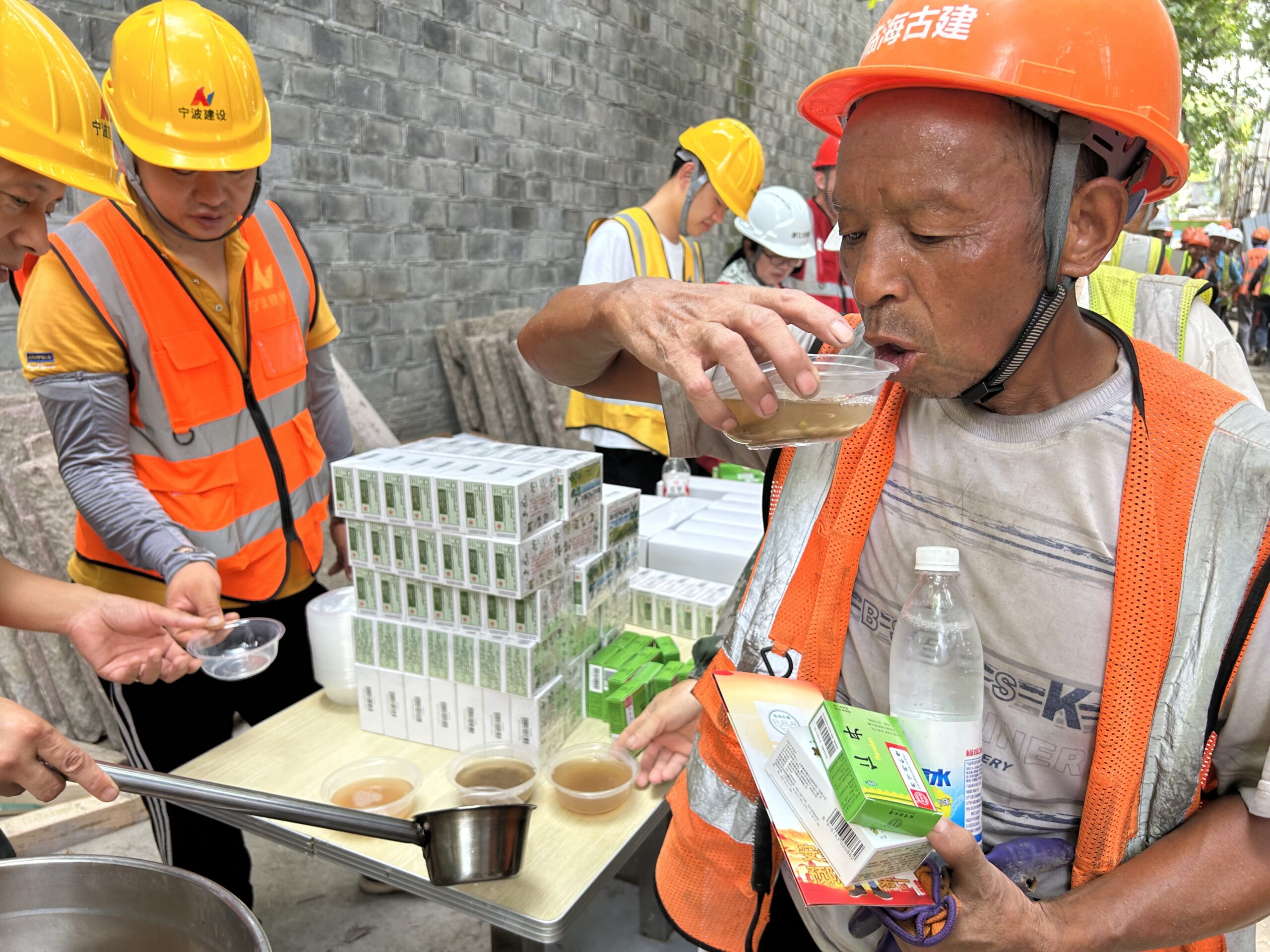 ? ? ? ?海曙區(qū)秀水街歷史文化街區(qū)改造項目,正在搶抓工期,現(xiàn)場有超過600余名工人頂著烈日堅守崗位。為保障現(xiàn)場施工人員身心健康,項目部配備了充足的防暑降溫藥品,提供綠豆湯等清涼飲,并多次在休息時間開展送清涼慰問,向現(xiàn)場作業(yè)人員發(fā)放防暑降溫藥品和安全提醒手冊,提醒工人務必注意高溫下的防暑降溫工作,預防“熱射病”等情況的出現(xiàn)。