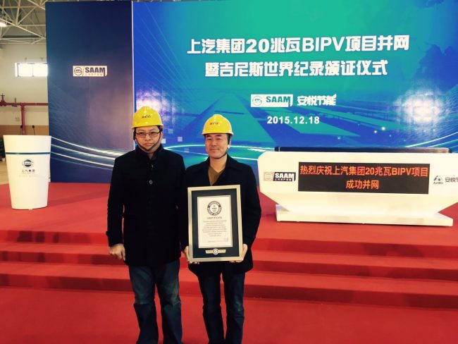 12月18日上午,世界最大光伏建筑一體化項(xiàng)目———上汽集團(tuán)55兆瓦分布式光伏項(xiàng)目一期20兆瓦發(fā)電項(xiàng)目在位于杭州灣新區(qū)的上汽大眾汽車有限公司寧波分公司并網(wǎng)發(fā)電,裝機(jī)容量打破了由上汽資產(chǎn)經(jīng)營公司自己保持的“全球最大光伏建筑一體化電站”吉尼斯世界紀(jì)錄。